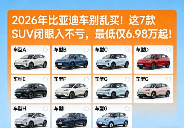 今天我就给大家梳理7款2026年最值得关注的比亚迪SUV,覆盖6万到23万各个价位段,都是当前市场上的热门选手。咱们一款一款来说,保证你看完心里就有谱了!