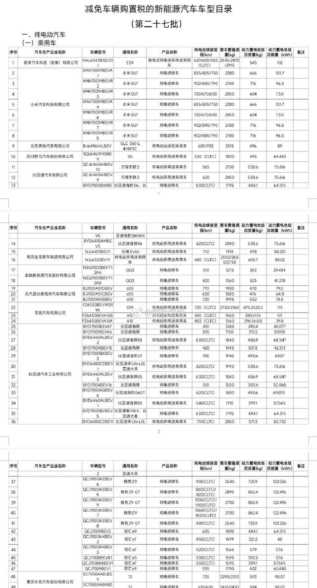最新一期工信部续航申报信息及购置税减免名单