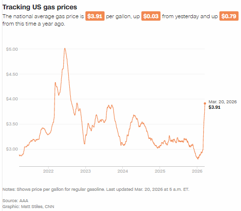 然而,这笔额外收入到来之际,许多人正承受着加油站的更大压力。全美汽油均价已飙升至 3.91 美元,自 2 月 28 日美以对伊朗开战以来,每加仑上涨了 93 美分。